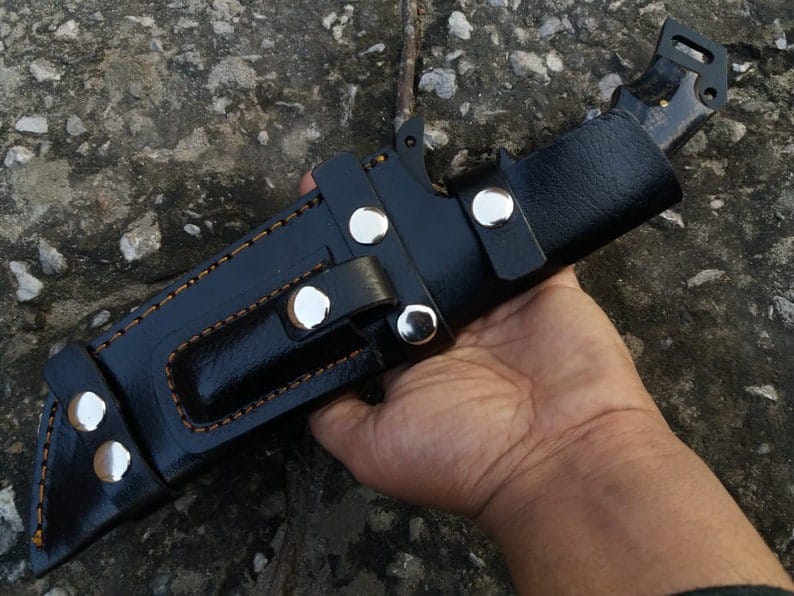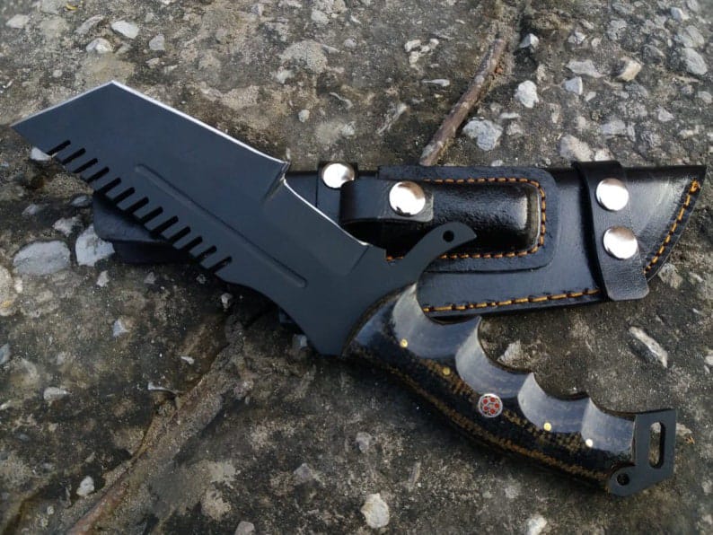 High carbon steel black coated hunting tracker knife with free leather cover.