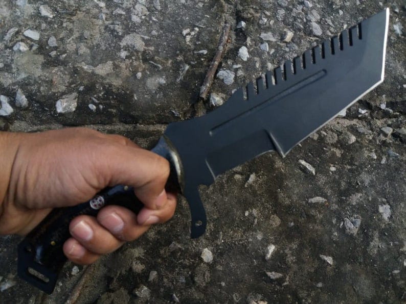 Solid, full tang High carbon steel 1095 (railroad) black coated hunting tracker knife. Cowhide quality black leather cover comes free with knife. 56- 58 HRC blade hardness holding a long-lasting solid edge.